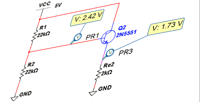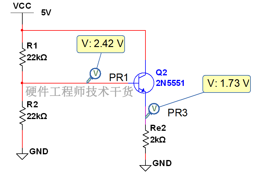 图中的仿真数据可以看出,射极电压比基极电压低0.7V左右,因为射极和基极之间是一个PN结。当基极施加出入正弦信号的时候,基极电位以2.42V为直流分量上下波动,射极电位以1.73V为直流分量上下波形。