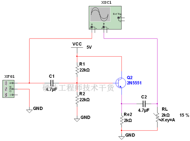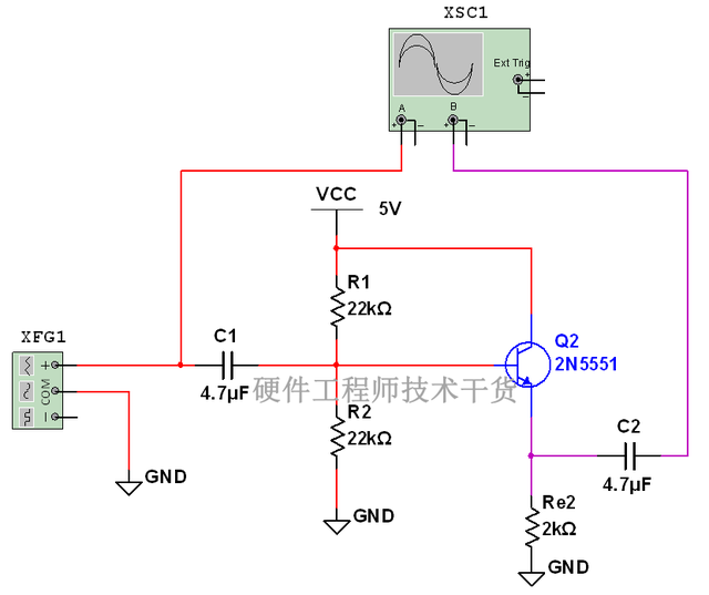 测量一下基极和射极波形,如下图所示,基极波形(红色),射极波形(紫色),虽然基极和射极波形都存在直流分量,但是波形形状一致,而且相差0.7V。射极电位跟随基极,随基极变化而变化,总是相差0.7V。