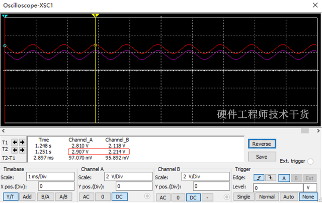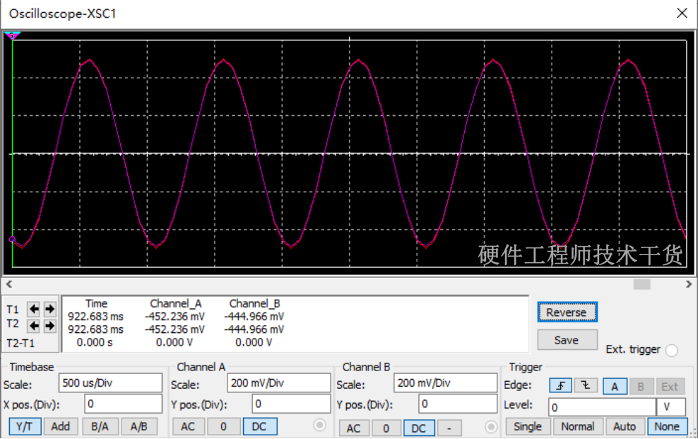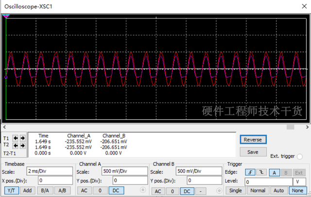 先来看一下输入输出波形,如下,输入波形(红色)和输出波形(紫色)几乎完全重合,也就是此电路放大倍数是1。因为输出隔直电容的存在,输出没有直流分量。