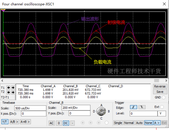 波谷被削是因为三极管射极电流下降为0所致。通过仿真电流波形,结果如下: