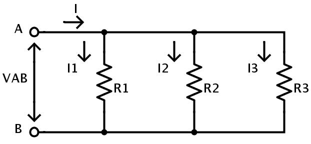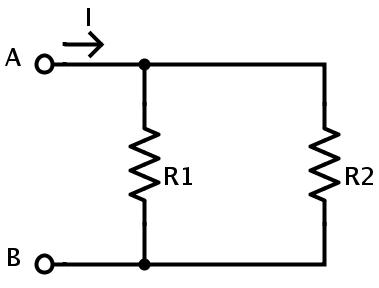 考虑一个由两个电阻组成的并联网络,电源电压V在两点A和B之间。