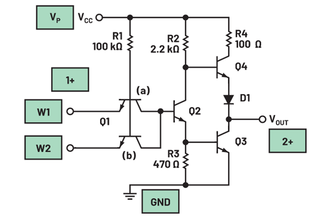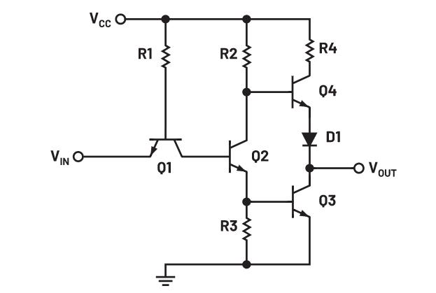 图1中的第二级晶体管Q2使用分相器来驱动上拉和下拉输出级的两半。它允许以相反相位产生输入条件,从而可以反相驱动输出晶体管。这样,Q4关断时Q3可以导通,反之亦然,