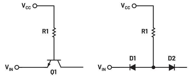 二极管D1用于提高Q4的有效导通电压,使其能够在Q3完全导通之前关断。这有助于防止逻辑状态转换期间潜在的大浪涌电流流入输出级。电阻R4还用于限制输出级中允许流动的电流。缺点是逻辑高电平会降低,降幅为二极管压降,如图11所示。