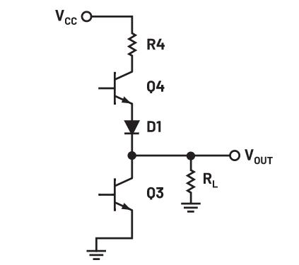 输出晶体管对Q3和Q4与二极管D1一起被称为图腾柱输出,如图4所示。这种输出配置提供了主动拉电流或灌电流的能力,对于驱动容性负载很有用。电阻R4用于限制VCC提供的电流。在稳态条件下,一次只有一个晶体管导通。