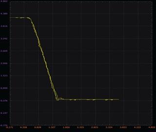 将波形发生器W1配置为具有0 V偏移和6 V幅度峰峰值的100 Hz三角波。在x-y模式下使用示波器观察电路的电压传输曲线。