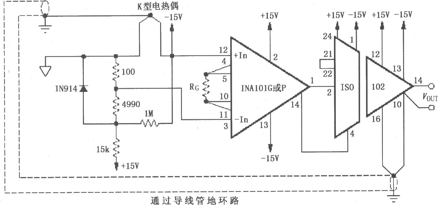 其中电阻Rc用于设置INA101的增益。该电路的特点是K型热电偶与ISO102副边的"地"相连接,即形成同电位,由此消除地环路造成的干扰。