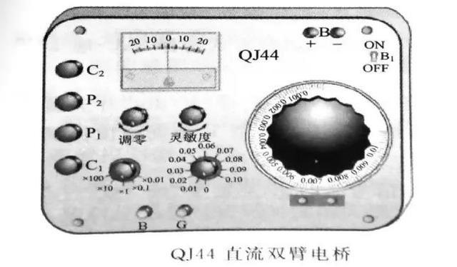 直流双臂电桥由检流计、直流电源、桥臂电阻、调节电阻、电流接头、电压接头等组成。其面板如下图所示。