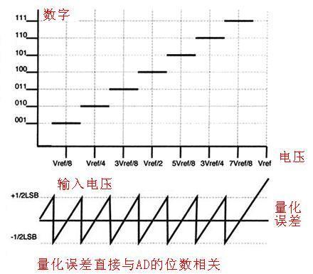 量化误差 (Quantizing Error) 由于AD的有限分辩率而引起的误差,即有限分辩率AD的阶梯状转移特性曲线与无限分辩率AD(理想AD)的转移特性曲线(直线)之间的最大偏差。通常是1 个或半个最小数字量的模拟变化量,表示为1LSB、1/2LSB。