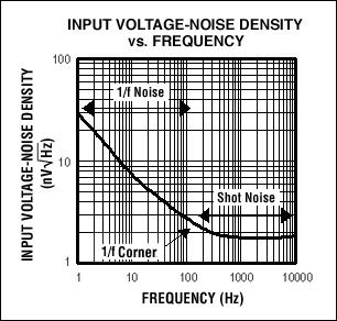 图1. 电压噪声密度与频率的关系曲线,主要受两种噪声源的影响:闪烁噪声和散粒噪声。闪烁噪声或1/f噪声与频率成反比,是频率低于200Hz时的主要噪声源。