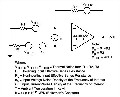 放大器电路的总噪声取决于放大器本身、外部电路阻抗、增益、电路带宽和环境温度等参数。电路的外部电阻所产生的热噪声也是总噪声的一部分。图2所示为放大器和相关噪声成份的实例。