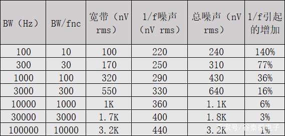 1/f噪声对超低频率电路是一大威胁,因为许多常用噪声抑制技术,像低通滤波、均值和长时间积分等,对它都无效。然而,许多直流电路的噪声是以白噪声源为主,1/f噪声对总噪声无贡献,因而不用计算1/f噪声。为了弄清这种效应,考虑一个放大器,其1/f噪声转折频率fnc为10 Hz,宽带噪声为10 nV/√Hz。对于各种带宽,计算10秒采集时间内包含和不含1/f噪声两种情况下的电路噪声,以确定不考虑1/f噪声的影响。当带宽为fnc的100倍时,宽带噪声开始占主导地位;当带宽超过fnc的1000倍时,1/f噪声微不足道。现代双极性放大器可以具有比10 Hz低很多的噪声转折频率,零漂移放大器则几乎完全消除了1/f噪声。