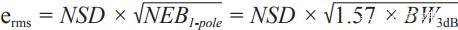 噪声等效带宽(NEB)对噪声计算是一个很有用的简化。由于截止频率以上的增益不是0,某些超出电路带宽的噪声会进入电路中。NEB是计算的理想砖墙滤波器的截止频率,它会放入与实际电路相同的噪声量。NEB大于–3 dB带宽,已针对常用滤波器类型和阶数进行计算,例如:对于单极点低通滤波器,它是–3 dB带宽的1.57倍,写成公式就是NEB1-pole = 1.57 × BW3dB。然而,关于应把该乘法因数放在噪声公式中的何处,似乎一直存在混淆。请记住,NEB调节的是带宽,而非噪声,因此应在根号下面,如下式所示: