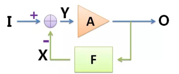 方框F是反馈器件,表示从输出O取出信号,并将其与F相乘,得到 X ,所以 X=0*F ,这里 F<1 (这个部分在实际电路中可以用电阻实现);