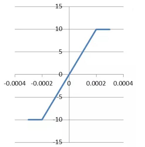 运放开环增益A常常高达几十万~几百万,但运放的输出电压受电源电压限制,不能超出电源电压。于是运放的输入-输出关系类似图4形状。