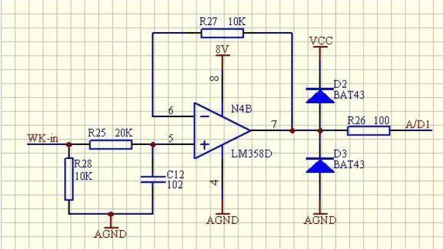 举个例子如图所示,R25的作用是消反射的,运放的5、6角理论上是电压相同的,且输入阻抗是无穷大!那么输入信号的电流主要是通过R28流入地,也就是输入点的电压在WK-in点形成,理论上不会有电流流入R25,如果没有R25那么信号就会100%反射到WK-in上,如果信号源的内阻非常的大,也就是带载的能力很差,反射的信号就会在R28的输入点附近形成很强的发射震荡也就是“回音”这样的噪声经过放大就会使输出信号质量很差,R25和C12的接入可以把在5pin的反射信号有效地吸收,高频的反射信号通过C12泄放到地(AGND)R25把反射的信号阻隔在5pin的输入端。