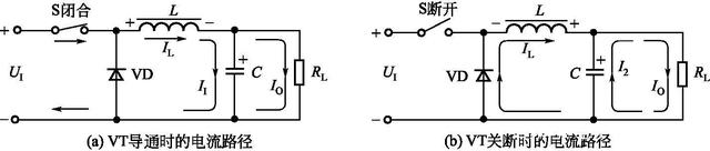 当VT导通(即S闭合)时,如图2-1-2(a)所示,续流二极管VD截止,输入电压U I 加到储能电感L的左端,因此L上施加了(U I -U O