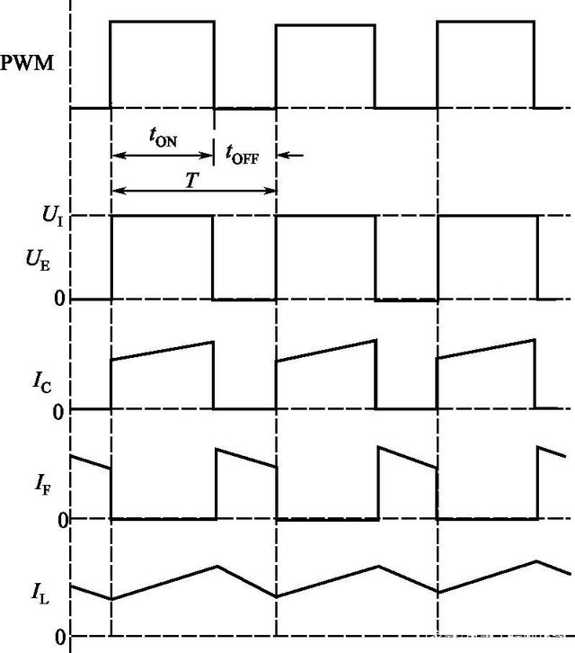 为滤波电感的电流波形。可以看出,功率开关管VT导通时,其发射极电压U E 等于输入电压U I ;在VT关断时,其发射极电压U E