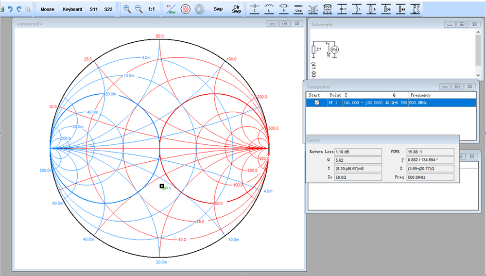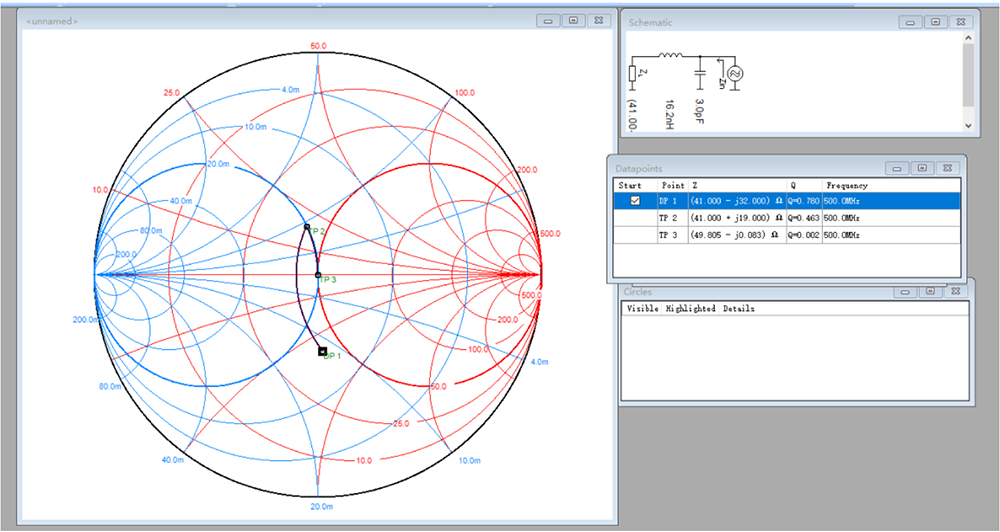 比如上图P1点需要往中心点靠,可以先阻抗图顺时针转,再导纳图顺时针转,即通过串电感,再并电容。如下图,串联16.2nH电感到P2点,再并联3.0pF电容到P3点。