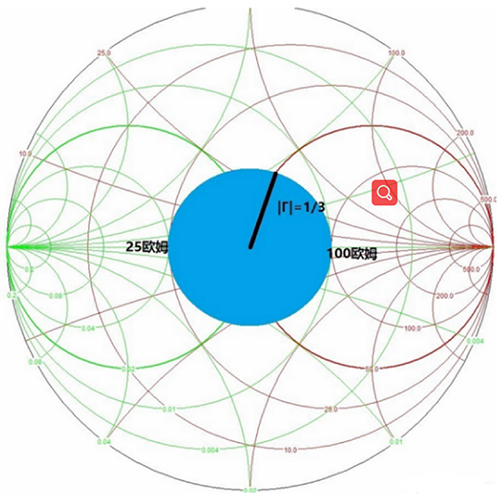 平时做阻抗匹配时不可能完全做到匹配后反射系数为0,通常希望反射系数绝对值小于1/3(这时对应RL≈-10dB,VSWR≈2,反射率≈11%),即下图蓝色区域。