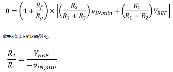 Rf 和 Rg 可以使用配置的传递函数确定,并且当 vIN 为 0 V 时,ADC 驱动器 (vAMP_OUT) 的输出等于 VREF/2 的条件。 求解 Rf 和 Rg 的方程可得到:
