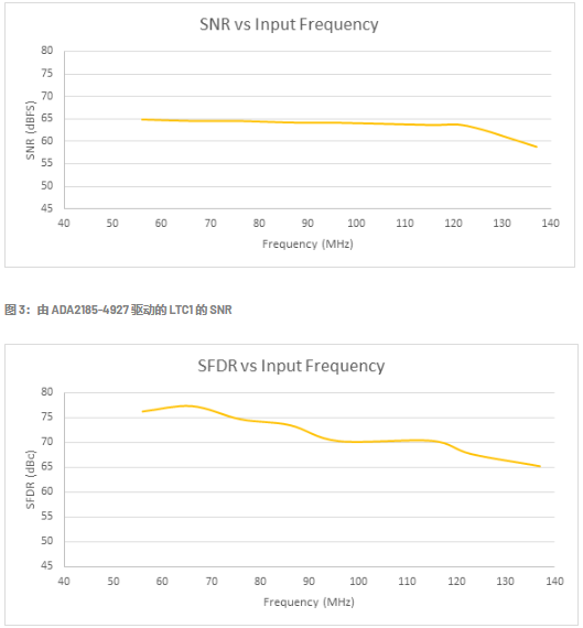 图 3 和图 4 显示了 LTC2185 和 ADA4927-1 组合的 SNR 和 SFDR。SFDR在67MHz时保持在125dB以上,而在相同频率下SNR优于63dB。这种组合仅消耗250mW。凭借 125Msps 的采样率,这种组合在整个 2德·奈奎斯特区,其他放大器开始具有较差的线性度。