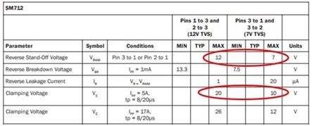 当出现不需要的高压瞬变时,TVS 二极管应起到钳位的作用;当收发器在正常条件下工作时,它们也应该是“透明的”。因此,首先要查看数据表上的额定关断电压VWM 这个参数。VWM 也称为额定工作电压,低于该电压则 TVS 为开路,并具有低待机漏电流。