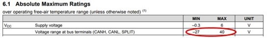 最后但同样重要的是,TI SN65HVD1040A 8 引脚 CAN 收发器具有相当高的绝对最大电压(图 7),这可简化 TVS 的选型。与RS-485 类似,CAN 总线也可以容忍一些共模电压变化(图 8)。