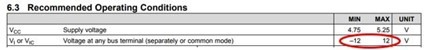 接下来,我们来看看 8 引脚 RS-485 收发器,即 TI 的 THVD1500。根据 RS-485 标准,RS-485收发器可以在宽共模范围(-7V 至 12V)下工作(图 3)。如图 4 所示,THVD1500 总线引脚的绝对最大电压为 ±18V。