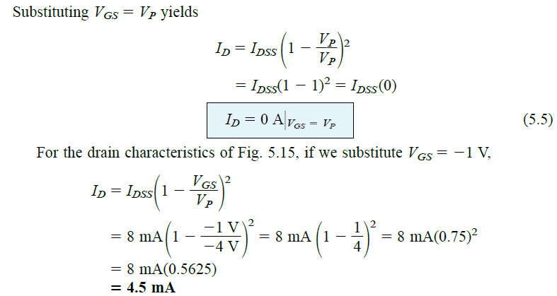 您也可以通过应用肖克利方程(方程5.15)直接获得图5.3传递曲线,前提是给出IDSS和Vp的值。