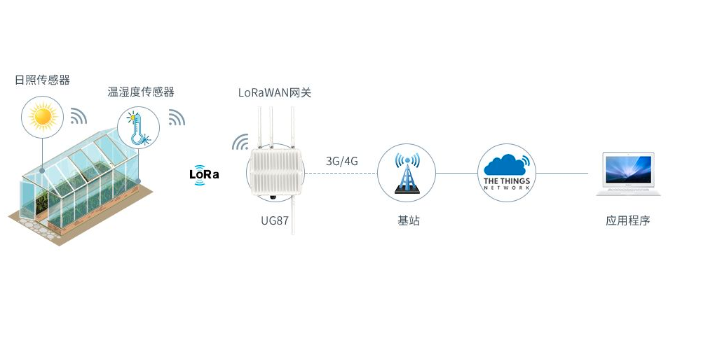 来自传感器的环境数据由UG87-LoRa网关通过高速4G网络发送至用户指定的网络服务器(NS),以进行近一步的开发应用。