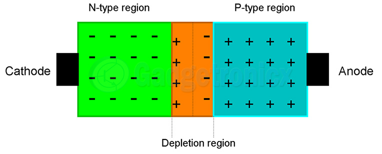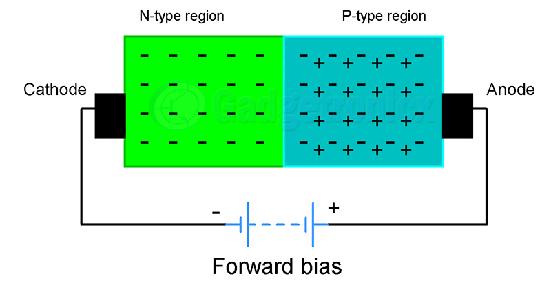 另一方面,当二极管正向偏置时,电源的正端连接到P型材料,负端连接到N型材料。因此,当施加电压时,电子通常从负极端子移动到正极端子。同样的事情在这里发生,正端吸引来自耗尽区域的电子和N型材料朝向它。当施加的偏置电压超过0.7v的势垒电位时(如果是硅二极管),就会发生这种情况。结果,耗尽层收缩并消失,允许电流在没有任何阻力的情况过结。