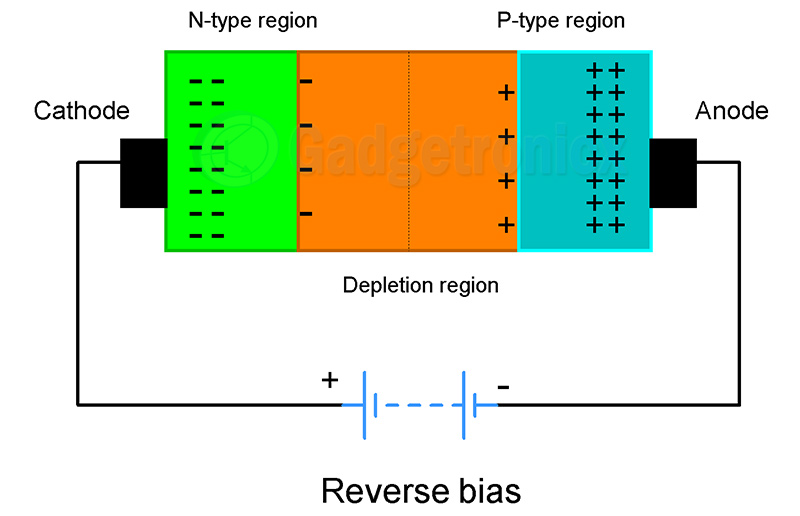 那么,是什么让这个耗尽区在反向偏置时阻塞电流呢?当二极管反向偏置时,P型材料将连接到电源的负极端子和N型区域到正极端子。结果,负极端子吸引靠近它的P型区域的所有正离子,正极端子在靠近它的N型区域吸引更多的负离子。这导致结点中现有耗尽层/屏障的进一步增长,从而完全阻止电流流动。当反向电压的增加会导致势垒破坏电流时,会对二极管造成不可逆转的损坏。因此,通过这种方法,二极管结构仅为正向偏置条件下的电流铺平了道路。