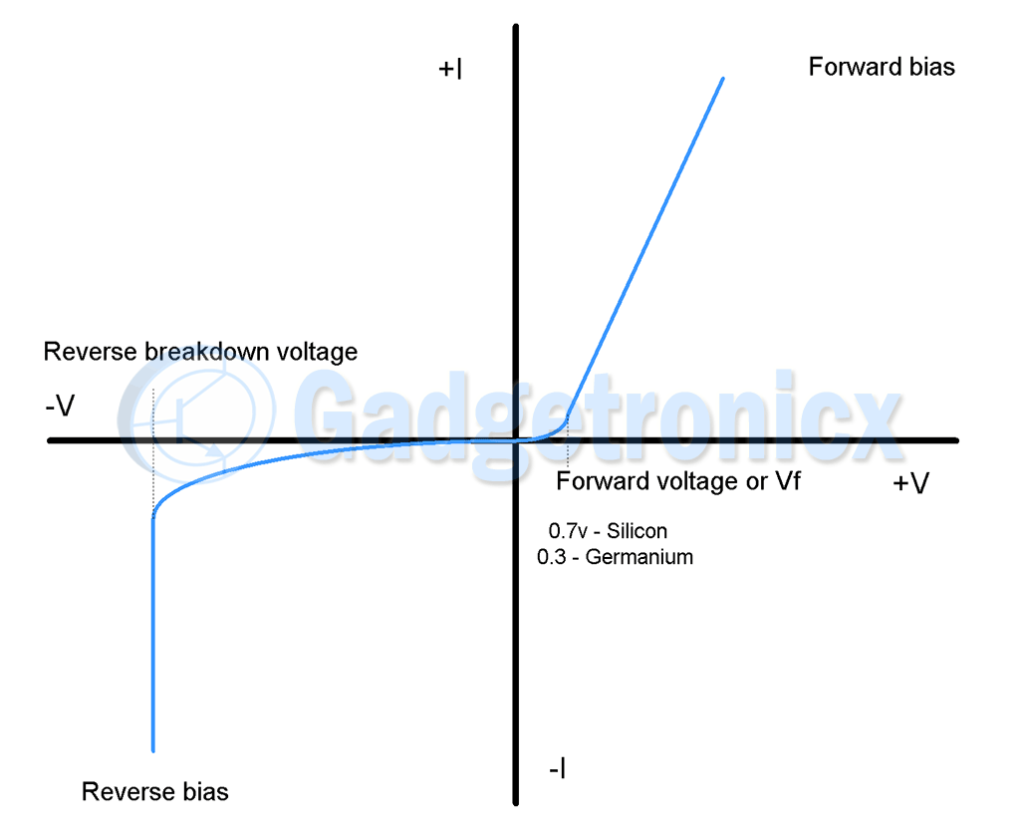 在零电压下观察到的正向偏置时,零电流将流过二极管。随着电压的持续升高,电流没有真正的升高。但是一旦施加的电压达到0.7v标记(对于硅二极管),电流就会急剧增加,达到二极管允许安全通过它的最大值。该电压称为二极管的正向电压或VF。对于锗二极管,该正向电压将为0.3v。此外,这种正向电压可以从一种类型或材料的二极管到另一种二极管而变化。二极管的这一特性将导致输入电压的压降等同于该正向电压值。假设一个二极管正向偏置,在硅二极管上施加5v,二极管阴极端子的合成电压将为4.3(0.7v