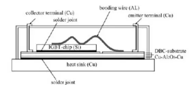 IGBT内的铝接合导线的直径通常为300-500um,他们的化学成分因生产厂商而异. 然而,几乎在所有情况下,在纯铝中加入千分之一的合金,例如硅镁或硅镍合金,铝的硬度会大大提升因而抗腐蚀性得以控制。由于与长度的不成比例以及轻微依赖衬底的温度,接合线的电流容量会有所下降。的直流电流受限于导线自身的欧姆热效应带来的熔化。由于铝接合线是直接接在芯片或压力缓冲器上,会承受较大的温度变化,而IGBT模块是由不同热膨胀系数的材料构成,在工作期间,必然会有明显的热疲劳.这种疲劳会随着工作时间的推移,导线自身的欧姆效应变得越来越明显,终在键合线根部产生裂痕。