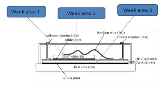 图1-3标注了IGBT模块在工作过程中容易发生疲劳损耗的点,具体有: