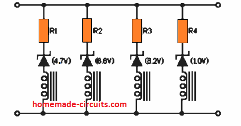 在这里,顺序递增齐纳二极管与一组继电器以及单独的低值串联电阻器串联安装。当电源接通时,齐纳二极管依次按齐纳二极管值的递增顺序导通。这导致继电器根据应用需要按顺序接通。电阻的值可以是10 欧姆或 20 欧姆,具体取决于继电器线圈的电阻值。