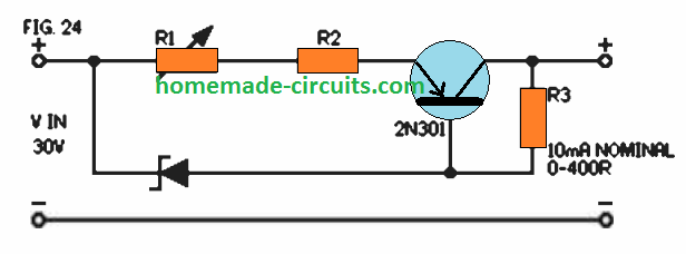 一个简单的齐纳稳压恒流电源可以通过单个晶体管设计为可变串联电阻器。下图显示了基本电路图。