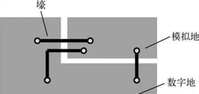 在进行混合信号PCB的设计时,如果必须对接地平面进行分割,而且必须由分割之间的间隙布线,则可以先在被分割的地之间进行单点连接,形成两个地之间的连接“桥”,然后经由该连接“桥”布线,如图2所示。这样,在每一个信号线的下方都能够提供一个直接的电流返回路径,从而可以使形成的环路面积很小。