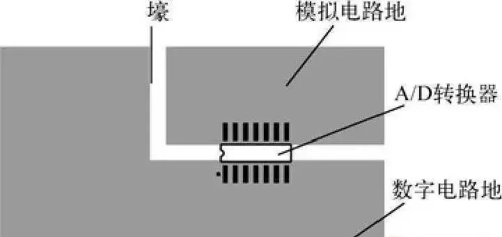 如果一个数字系统使用一个ADC,如图3所示,则可以将“地平面”分割开,在ADC芯片的下面把模拟地和数字地部分连接在一起。但是要求必须保证两个地之间的连接桥宽度与IC等宽,并且任何信号线都不能跨越分割间隙。