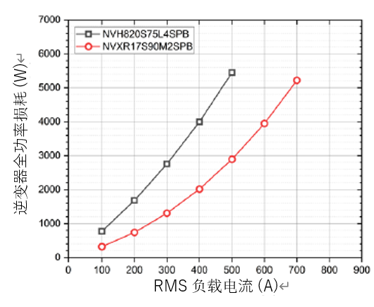 图 3 到图 6比较了 IGBT 效率与 SiC 效率。在图 3 和图 4中,NVH820S75L4SPB是 IGBT 模块(方形连线图),而NVXR17S90M2SPB是 SiC 模块(圆形连线图)。这两张图显示了 IGBT 因开关频率和 RMS 负载电流具有更高的功率损耗。图 5 和图 6 显示,以更高频率运行的 SiC 可实现出色的效率增益。