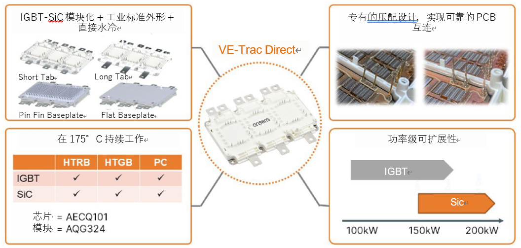 通过与安森美合作,工程师可以探索各种选择。安森美拥有完整的主驱逆变器解决方案组合,包括 IGBT 和 SiC 技术,因此 OEM 和一级供应商可以为其应用找到合适的逆变器半导体解决方案。安森美为 EV 和 HEV 应用提供广泛的牵引逆变器解决方案,VE-Trac 系列就是用于汽车功能电子化的高度集成功率模块。这些模块采用创新的封装、先进的散热技术并具备出色的可靠性。