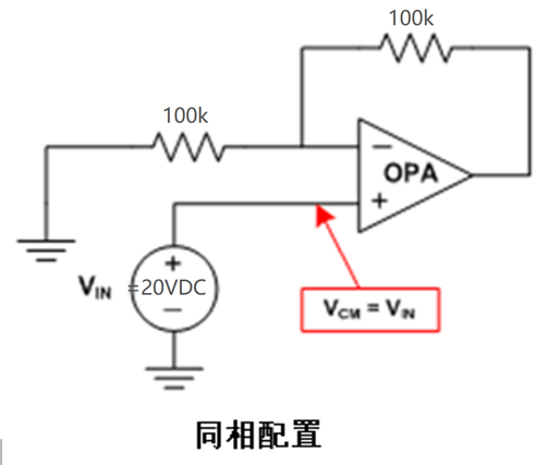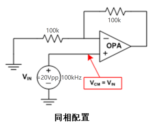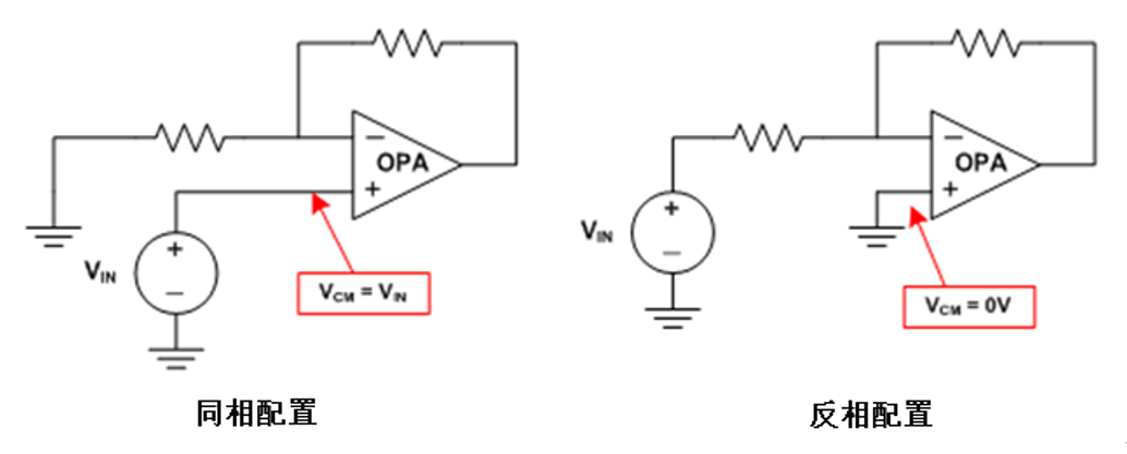 定义为同相和反相输入端的电压的平均值,即: VCM=( VIN+ + VIN-)/2。如下图,同相输入放大器的VCM=VIN,反相放大器的VCM=0