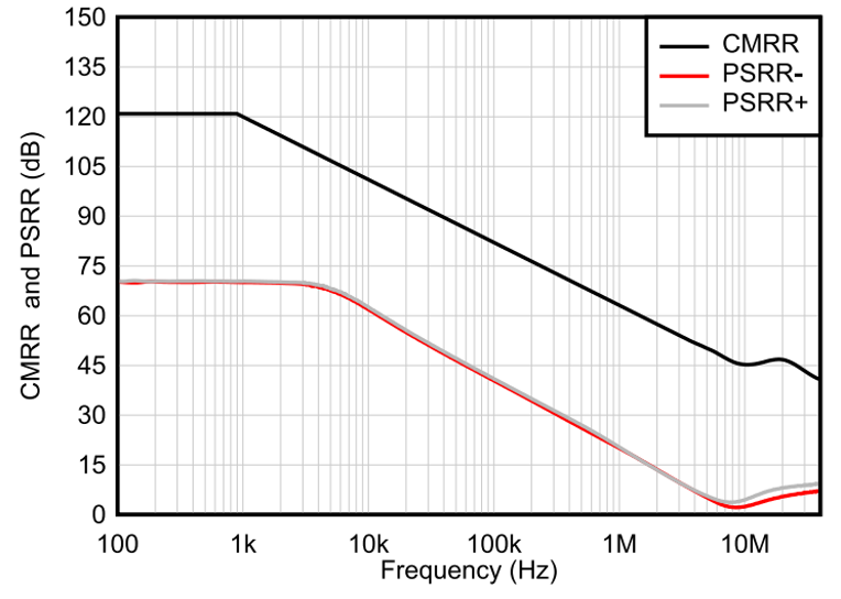 运放的CMRR是随频率的增加而降低的,Datasheeft中通常会给出一个曲线来表示这这一变化。如下图:
