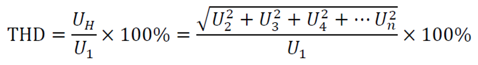 对时域信号进行傅里叶变换,用如下公式表示THD,其中U1是基波的有效值;得到各次谐波大小,U2表示二次谐波,U3表示三次谐波, …Un表示n次谐波有效值,用UH表示所有谐波的有效值。