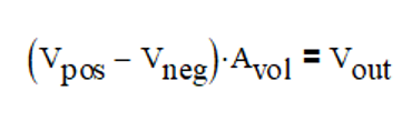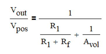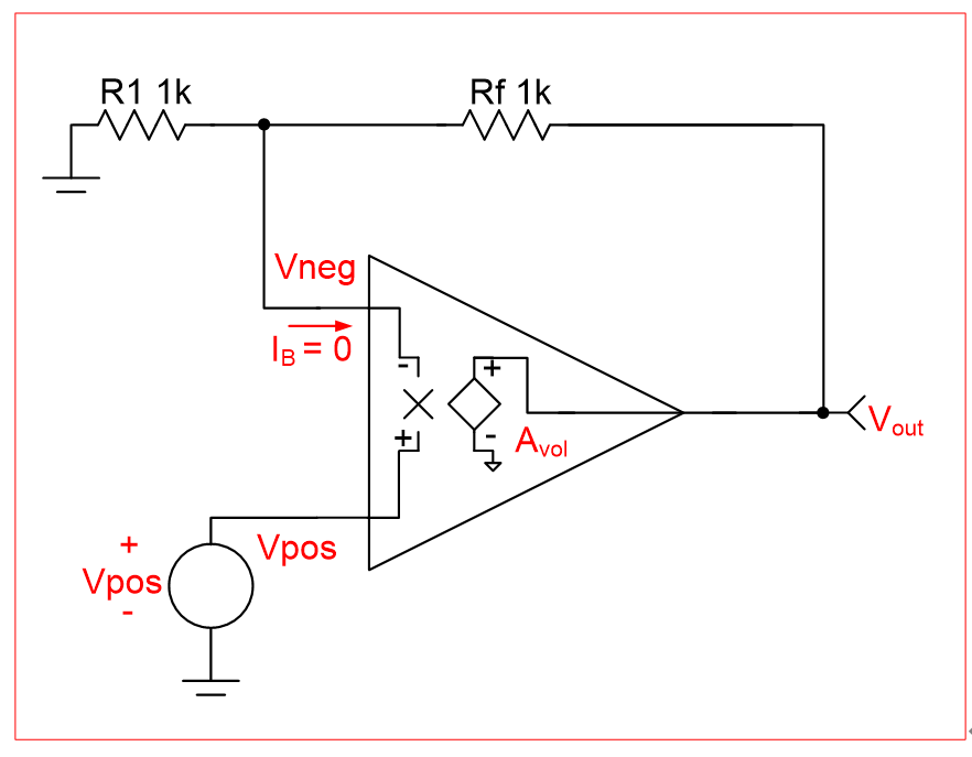 如上图,是一个同相比例放大电路(Close Loop Gain=2),根据运算放大器开环增益的定义,Avol=Vout/(Vpos-Vneg),可以得到:
