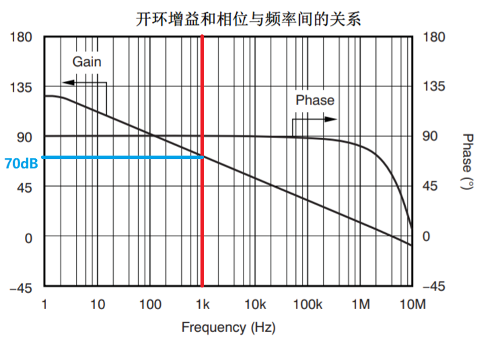 基于此,我们来看看对于实际的运算放大器,开环增益对1kHz的正弦波的放大的影响,下图是德州仪器OPA2171规格书中开环增益曲线,从图中读出在1kHz的时候,开环增益是70dB,即10^3.5=3162,将3162代入上述闭环增益表达式得到闭环增益是1.9987,相比预期的Close Loop Gain=2偏差了0.065%。