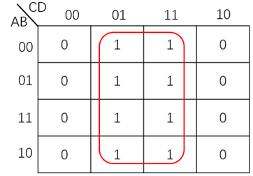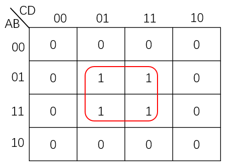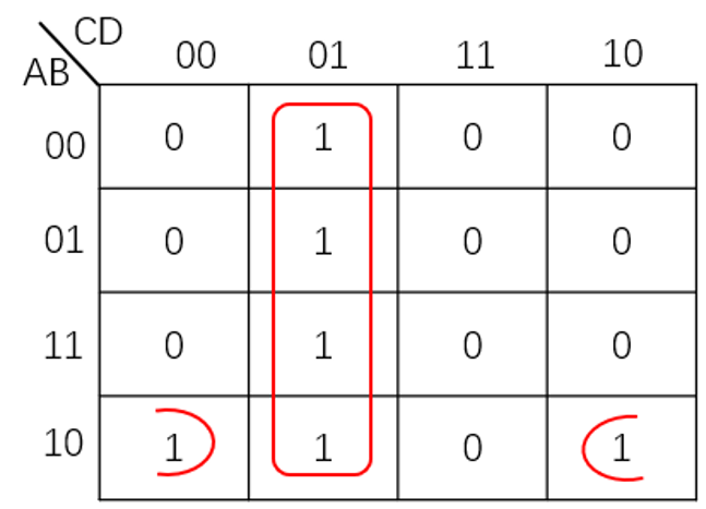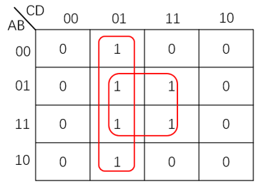然后我们例如卡诺图,将可能合并的最小项圈出,并按照前面所述的原则进行化简后与或式中的乘积项,于是我们得到化简后的表达式:
