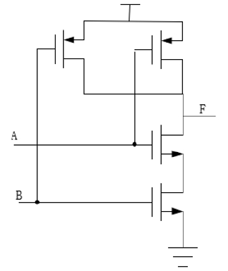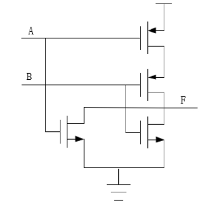 **我们以与非门为例子图2 为一个二输入与非门。PDN网络由俩个串联的NMOS器件构成,在A和B均为高时导通。PUN是它的对偶网络,由俩个并联的PMOS构成。这意味着,如果A=0或者B=0则F为1,这相当于