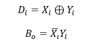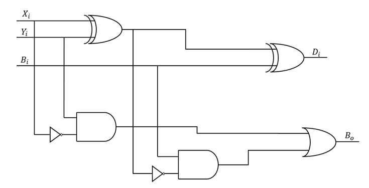 半减器用于计算两bit Xi和Yi的减法,输出结果Di和向高位的借位Bo(Borrow output)。其真值表、逻辑表达式如下: