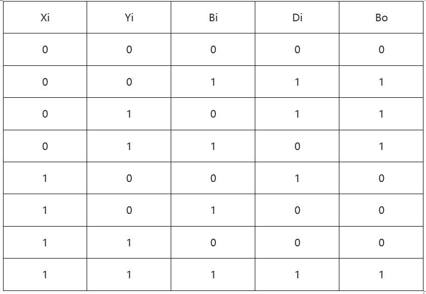 全减器不同于半减器在于,全减器输入来自低位的借位Bi(Borrow input),另外两个输入xi、yi,输出为Di和向高位借位Bo。